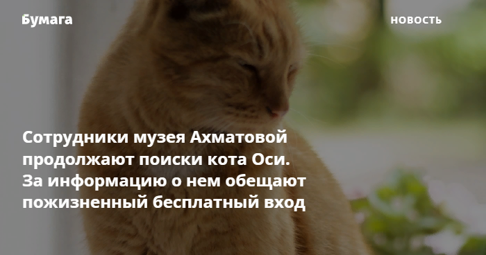Музей Анны Ахматовой объявил вознаграждение за достоверную информацию о местонахождении пропавшего кота Оси.