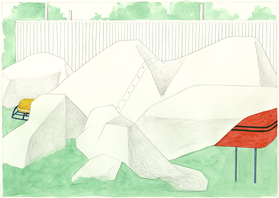 © Предоставлено галереей «Триумф» Кейто Ямагути. Из серии «Срок службы». 2016. Карандаш, акварель, бумага Ирина Филатова и Кейто Ямагути будто в приближении фрагментируют мир из фотографий Шера, работая с деталями и характерными особенностями нового русского пейзажа, неуклюжими домами, заборами, трубами и людьми, которые сливаются с окружением, словно хотят спрятаться в нем. Плоды новой экономической реальности и полусонного бытования промышленных зон и транспортных узлов исследуются в произведениях Павла Отдельнова, Юлии Малининой, Алексея Мальцева. Эскапизм рафинированных пейзажей Павла Блохина и тонкие интервенции в ландшафт Федора Тощева демонстрируют взгляд в совершенно «другую сторону». Работа с памятью, распавшейся на фрагменты, растворившейся в линиях, исчезнувшей за белой пеленой, оставившей персонажей в сумеречной зоне, объединяет Егора Плотникова, Ольгу Давыдову, Алексея Хамкина, Евгению Буравлеву.