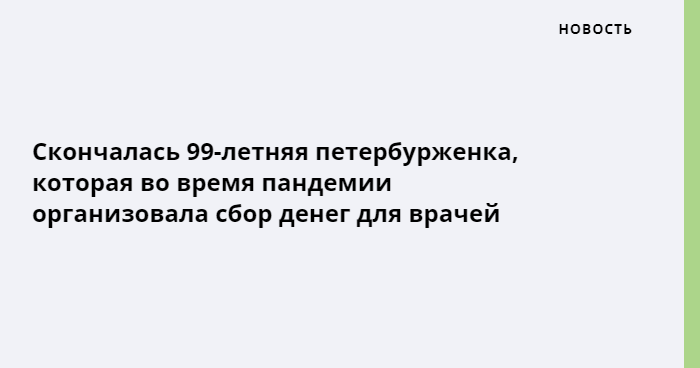 В Петербурге скончалась Зинаида Корнева — 99-летняя женщина, которая во время пандемии запустила сбор денег для медработников. Она прошла Великую Отечественную войну как зенитчица-наводчица и снимала об этом ролики на ютьюб. Таким образом она собрала более 4 миллионов рублей.