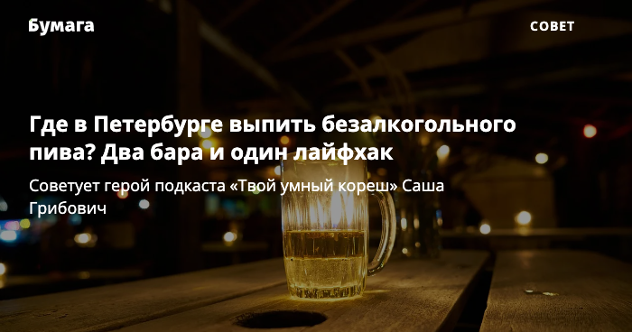 Если без похода в бары не обойтись, попробуйте «Джоус спот» на Маяковского: у них три разных безалкогольных позиции. Хороший выбор пива и в «Пивной карте» на Восстания.