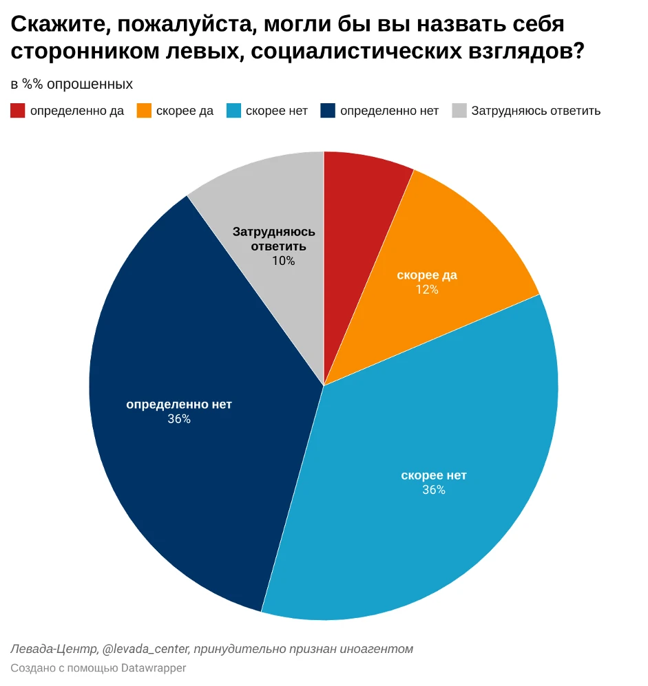 В то же время в целом по России подавляющее большинство (72%) граждан не разделяет левые, социалистические убеждения. В общей сложности каждый пятый респондент (18%) придерживается левых взглядов.
