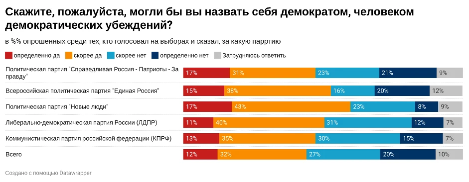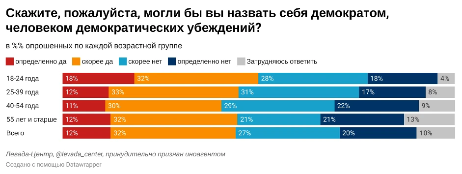 Согласно данным опроса (есть в распоряжении «Новой газеты»), среди не поддерживающих демократические убеждения больше всего людей в возрасте от 40 до 54 лет. При этом 44% опрошенных россиян все же считают себя демократами. В наибольшей степени демократические ценности разделяют молодые люди до 24 лет (50%). На втором месте по количеству людей, считающих себя демократами, находится возрастная группа от 25 до 39 лет. В ней демократические ценности поддерживают 45% процентов респондентов.