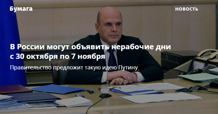 В России могут объявить нерабочие дни с 30 октября по 7 ноября. Правительство предложит такую идею Путину