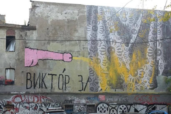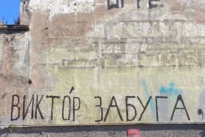 В 2021 году Виктор Забуга оставил на фасаде дома культуры Х-летия Октября свой тег — простую, но большую надпись из имени и фамилии. Забуга редко оставляет подобные теги — он более известен постерами со своим лицом или затылком.