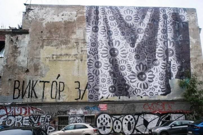 В сентябре другой петербургский художник — Максим Гамма, который чаще всего работает с постерами с изображением улыбающегося цветка, — перекрыл тег Виктора Забуги своим стрит-артом. Он нарисовал простыню, покрытую цветами, свисающую с крыши дома культуры.