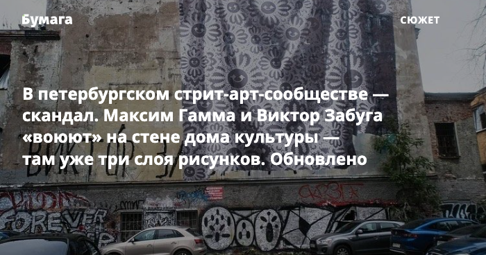 В петербургском стрит-арт-сообществе — скандал. Максим Гамма и Виктор Забуга «воюют» на стене дома культуры — там уже три слоя рисунков. Обновлено