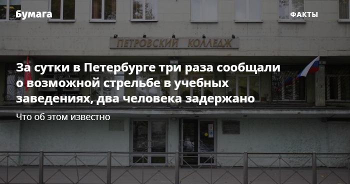 Вечером 21 октября в петербургских СМИ появились сообщения о стрельбе у Петровского колледжа. В пресс-службе учебного заведения «Бумаге» сказали: возле колледжа прозвучал один выстрел, стрелявший задержан.