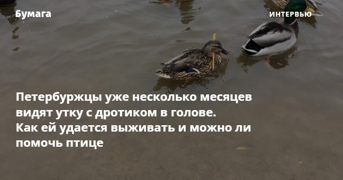 Петербуржцы уже около полугода сообщают об утке с дротиком в голове. Птицу видят в разных водоемах на севере Петербурга, горожане подкармливают ее, обсуждают, как можно помочь птице, и обращаются к спасателям.
