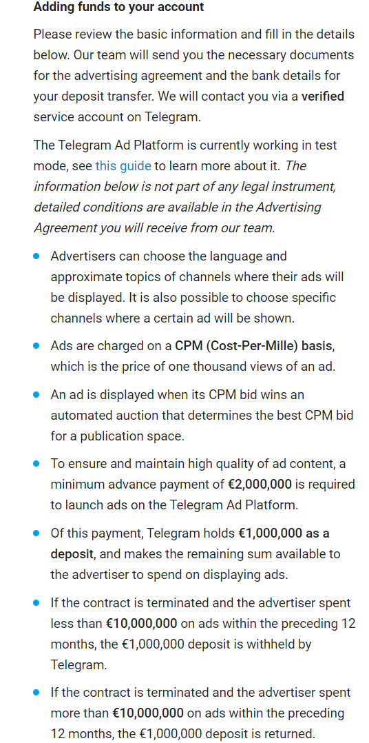 В инструкции по пользованию новой рекламной платформой Telegram указывает, что стоимость рекламы в Telegram — от €2 за 1000 показов. А уже после создания и логина в рекламном кабинете указано второе правило: для запуска любой кампании надо внести аванс €2 млн. Половина суммы будет заморожена в качестве депозита. Более того, если рекламодатель разрывает контракт, то, если в предыдущие 12 месяцев он потратил на рекламу в Telegram меньше €10 млн, депозит на €1 млн не возвращается. Перед этими условиями, впрочем, отмечается, что они «не являются частью какого-либо правового документа». Первым на эти пункты обратил внимание канал «Код Дурова».
