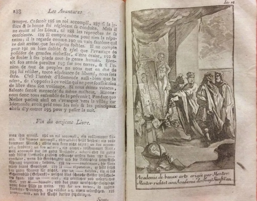 Ментор учреждает Академию изящных искусств. Из немецкого учебного издания 1795 годаРоман, противоположный королевским желаниям, вызвал удаление Фенелона от двора и принес ему мировую славу на два столетия. Впрочем, не один Людовик XIV был недоволен тенденцией романа. Критиковал его и Вольтер. В стихотворении «Человек света» он пишет: