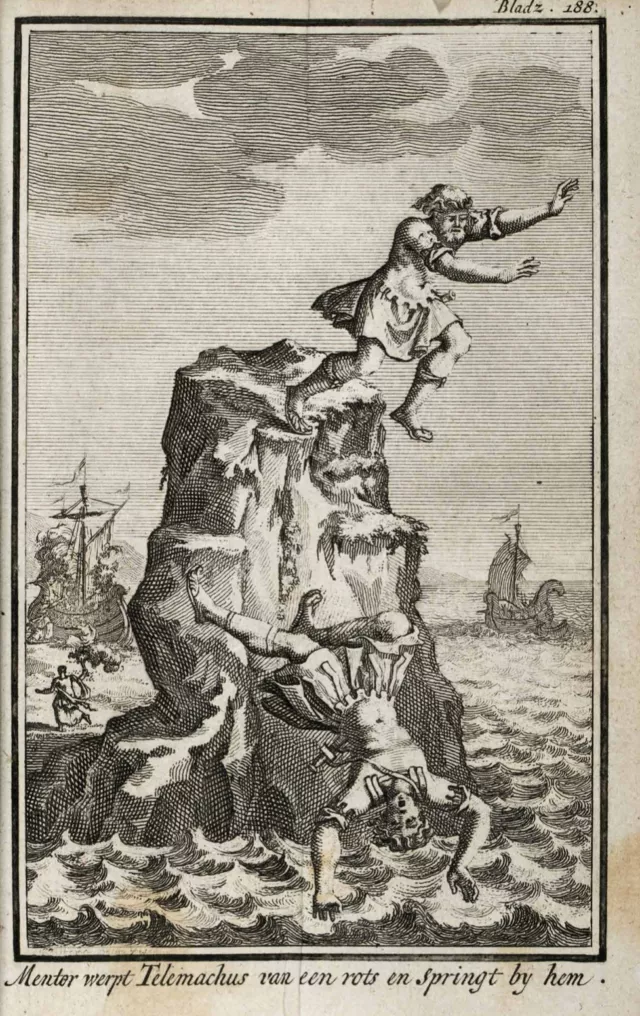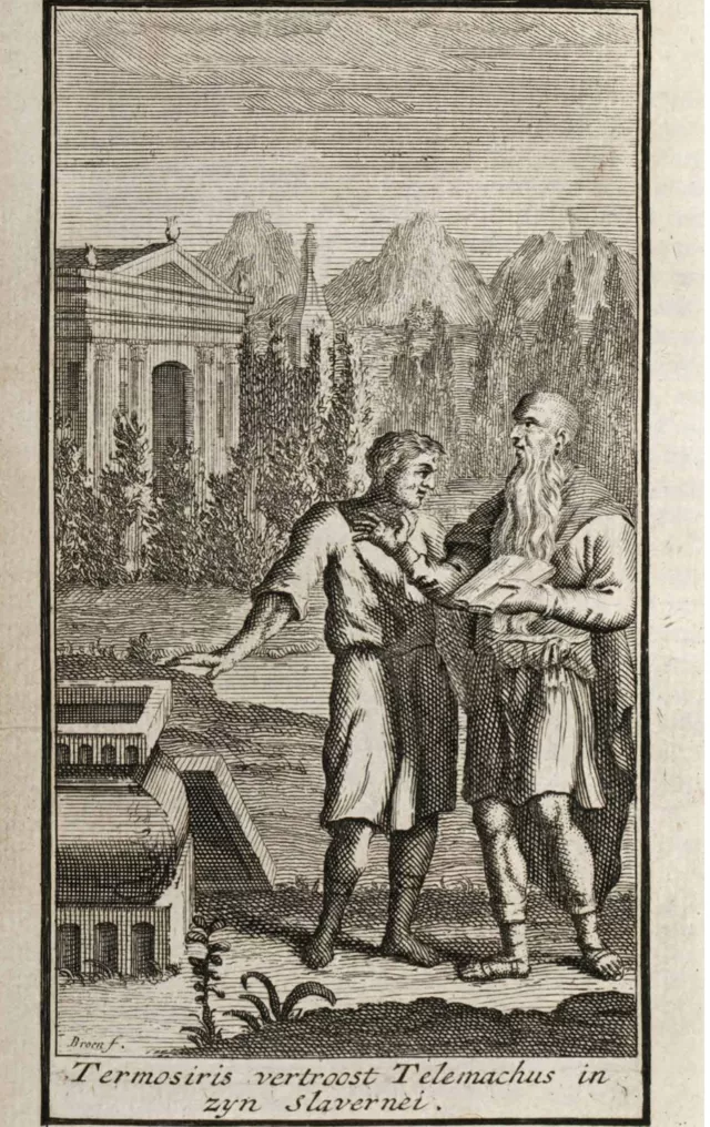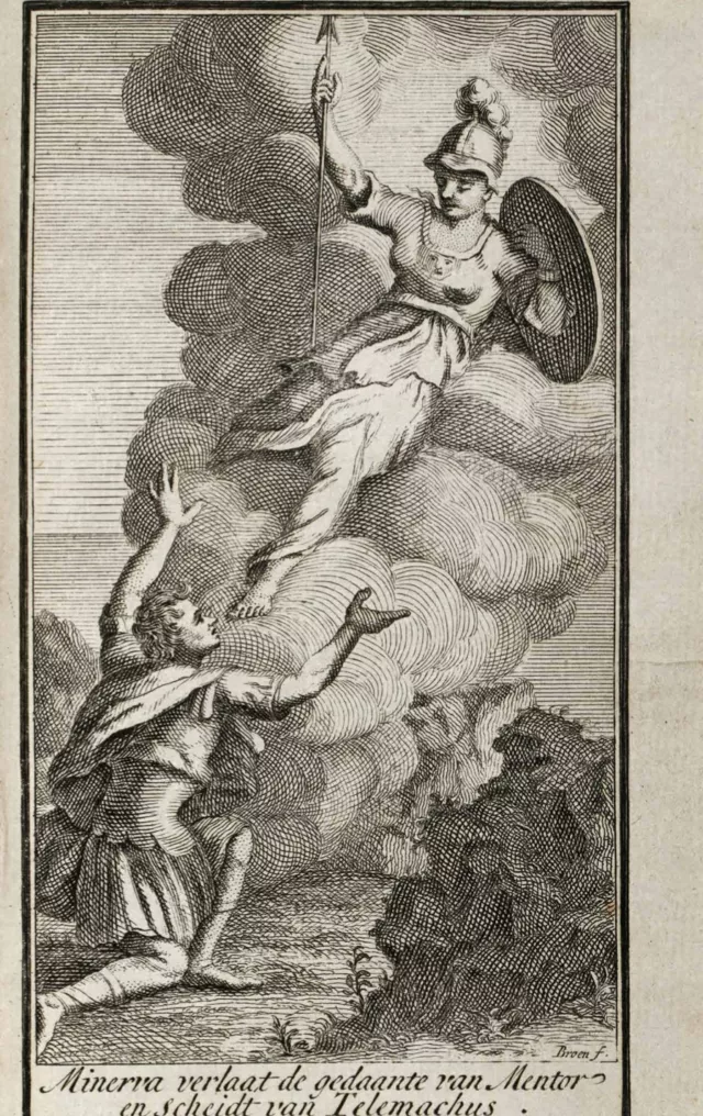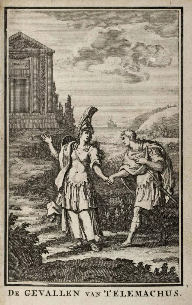 Иллюстрации к роману в голландском издании 1730 года Отчего ж Фенелон не написал свой эпос/роман стихами? Собственно, литературная задача стояла у него на втором плане. Античный эпос, как известно, делится на героический и дидактический. Фенелон сумел совместить и то и другое: в форму прозаической эпопеи с главным героем — доблестным Телемахом — была облечена учебная задача, и читатель предполагался единственный — Людовик, герцог Бургундский (1682—1712), внук короля-солнца (царствовать ему не довелось) и отец следующего короля, Людовика XV. Впрочем, образовательная традиция Франции предполагает, что вещи, предназначенные для воспитания высших лиц, доступны и широкой публике (вспомним знаменитую серию Ad usum Delphini!). Ментор, под видом которого в романе действует богиня мудрости Афина, стал именем нарицательным.