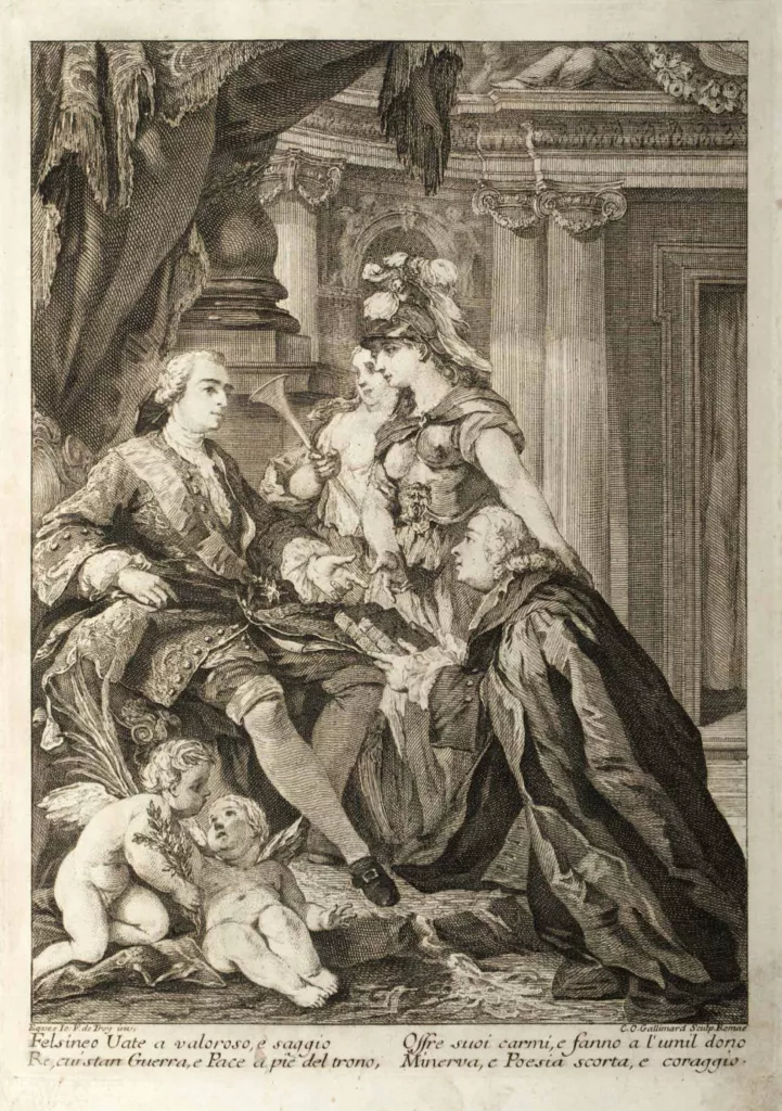 Итальянский переводчик Фламинио Скарселли подносит свой труд Людовику XV (фронтиспис издания перевода)Отметим еще одну особенность воспоминаний Болотова. Он пишет о впечатлении, которое — наряду с текстом — произвели на него картинки. И это весьма важная черта: в моей библиотеке есть три переводных издания «Телемаха», голландское (не тот перевод, о котором шла речь, а прозаический, 1730 года издания), и два поэтических — латинский и итальянский. И только второй ограничивается роскошным фронтисписом. Еще у меня есть немецкое учебное издание 1795 года и случайное французское XIX века, купленное на заре юности, когда я еще не имел понятия о том, что такое старая и редкая книга. Они тоже с гравюрами. Иллюстрированный «Телемах» — для XVIII века такое же правило, как сейчас — лишенный картинок.