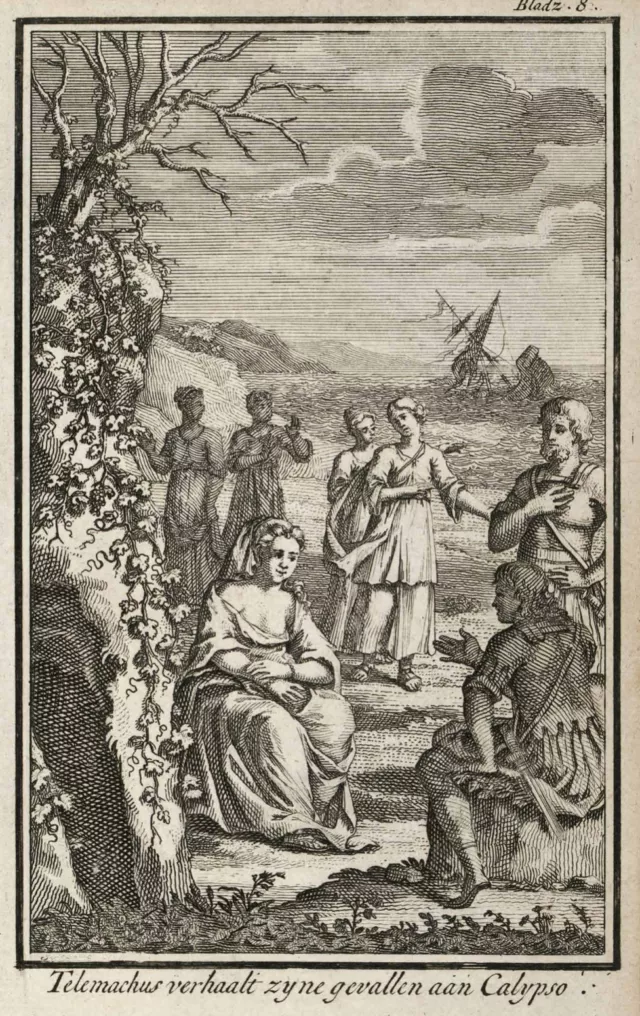 Удивлением и жалостию обятая Калипса, видя в таковой нежной юности толико мудрости и красноречия, не могла насытить очей своих взирая на Телемака, и пребывала в безмолвии. Наконец рекла ему: Поведаю тебе, Телемак, что с отцем твоим приключилося; но повесть о нем продолжительна. Днесь упокойся от трудов твоих. Гряди в мое жилище, где я приму тебя как своего сына; гряди, ты в уединенной сей обители будешь мне утешением, и я устрою твое благоденствиe, когда токмо уразумееш оным наслаждаться.
