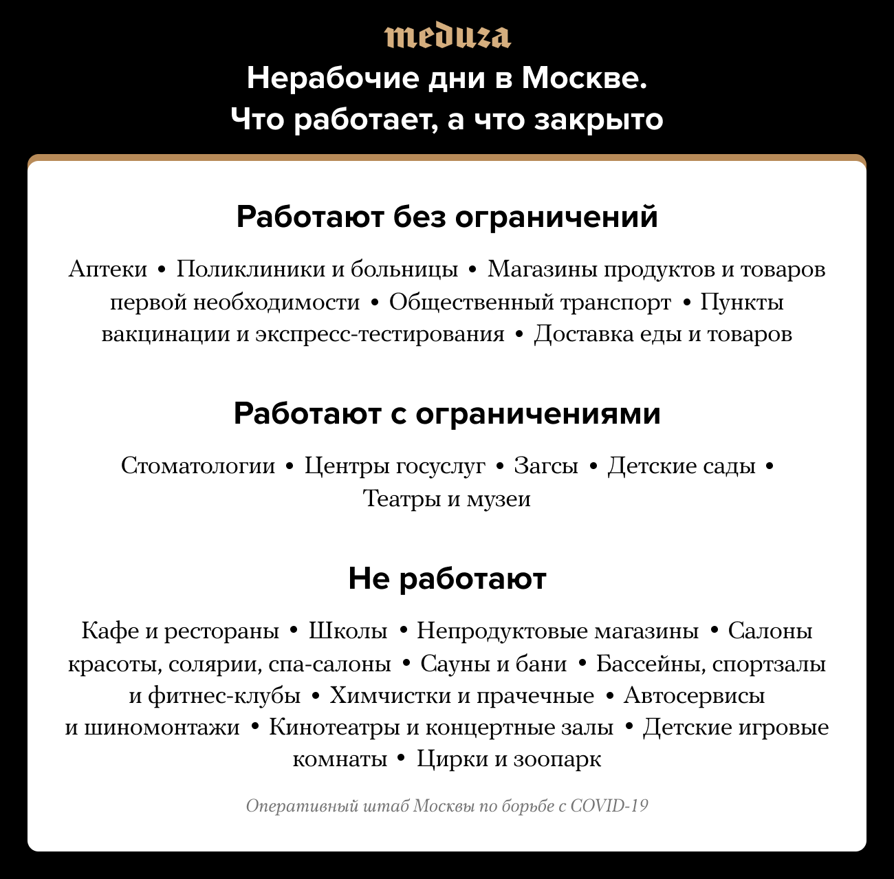 - Власти Москвы потребовали от магазинов, специализирующихся на продаже алкоголя, закрыться на время «нерабочих дней». Работать смогут только те магазины, где 30% ассортимента составляют продукты.