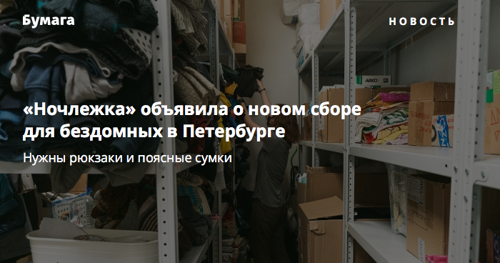 «Ночлежка» объявила о новом сборе для бездомных в Петербурге — нужны рюкзаки и поясные сумки. Об этом благотворительная организация сообщила во «ВКонтакте».
