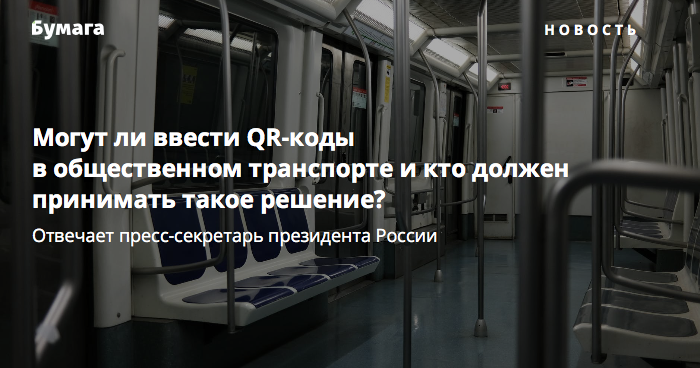 Пресс-секретарь президента России Дмитрий Песков ответил на вопрос журналистов о возможности введения QR-кодов в общественном транспорте. По его словам, он не исключает такой вариант, а решение об этом должны принимать руководители субъектов РФ.