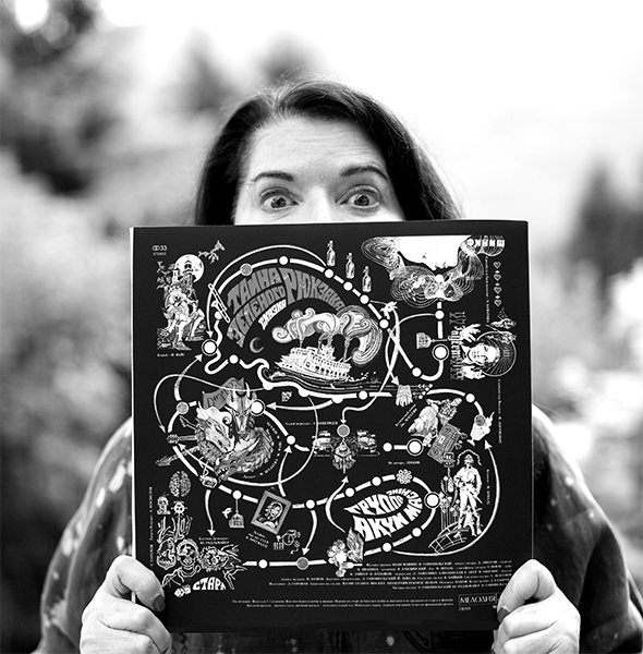 У меня был старый граммофон, но только одна пластинка Перри Комо — и все. Папа мне ее купил. Потом, я не знаю, мы с мамой слушали старое радио из бакелита, больше ничего не было. Все по радио. А потом, когда у нас впервые появился телевизор, он показывал только по вечерам военные фильмы: про Аушвиц, про убийства и про плохих немцев, все в таком духе. А по утрам по телевизору показывали только сетку настройки. И мы с братом сидели и часами смотрели на эту сетку. Я думаю, это был мой первый опыт медитации. Смотреть сетку настройки. Но сейчас вы увидите что-то совсем другое (берет со стола пластинку). Я хочу обратить ваше внимание на пластинку akyn machine, где рассказана история про тайну зеленого рюкзака. Там столько всего происходит! И вы должны послушать это прямо сейчас.