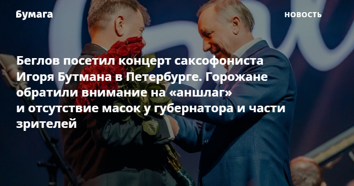 В КСК «Тинькофф Арена» 28 октября прошел концерт саксофониста Игоря Бутмана. Пользователи соцсетей, СМИ и представители концертной индустрии обратили внимание на аншлаг и отсутствие масок у части зрителей и у губернатора Петербурга, тоже присутствовавшего на выступлении.