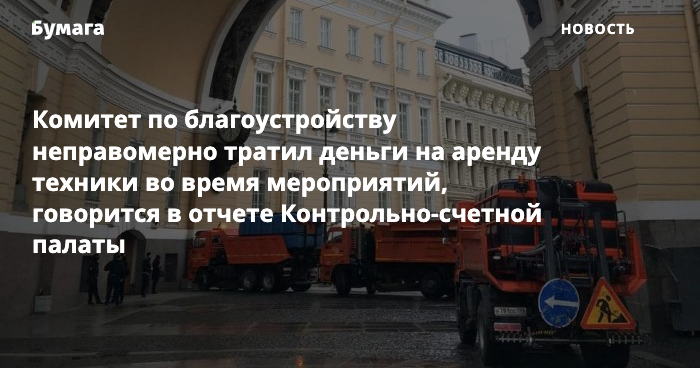 Согласно выводам аудиторов КСП, комитет по благоустройству завысил потребности для антитеррористических мер во время массовых мероприятий и на покупку 274 единиц уборочной техники. Как считают аудиторы, подведомственное комблагу предприятие «Центр» не нуждалось в этой технике, сразу после приобретения ее передали сторонним организациям.