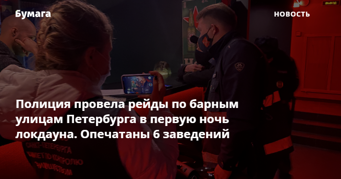 Комитет по контролю за имуществом, Роспотребнадзор и полиция провели совместный рейд в первую ночь локдауна в Петербурге. Об этом сообщается на сайте Смольного.