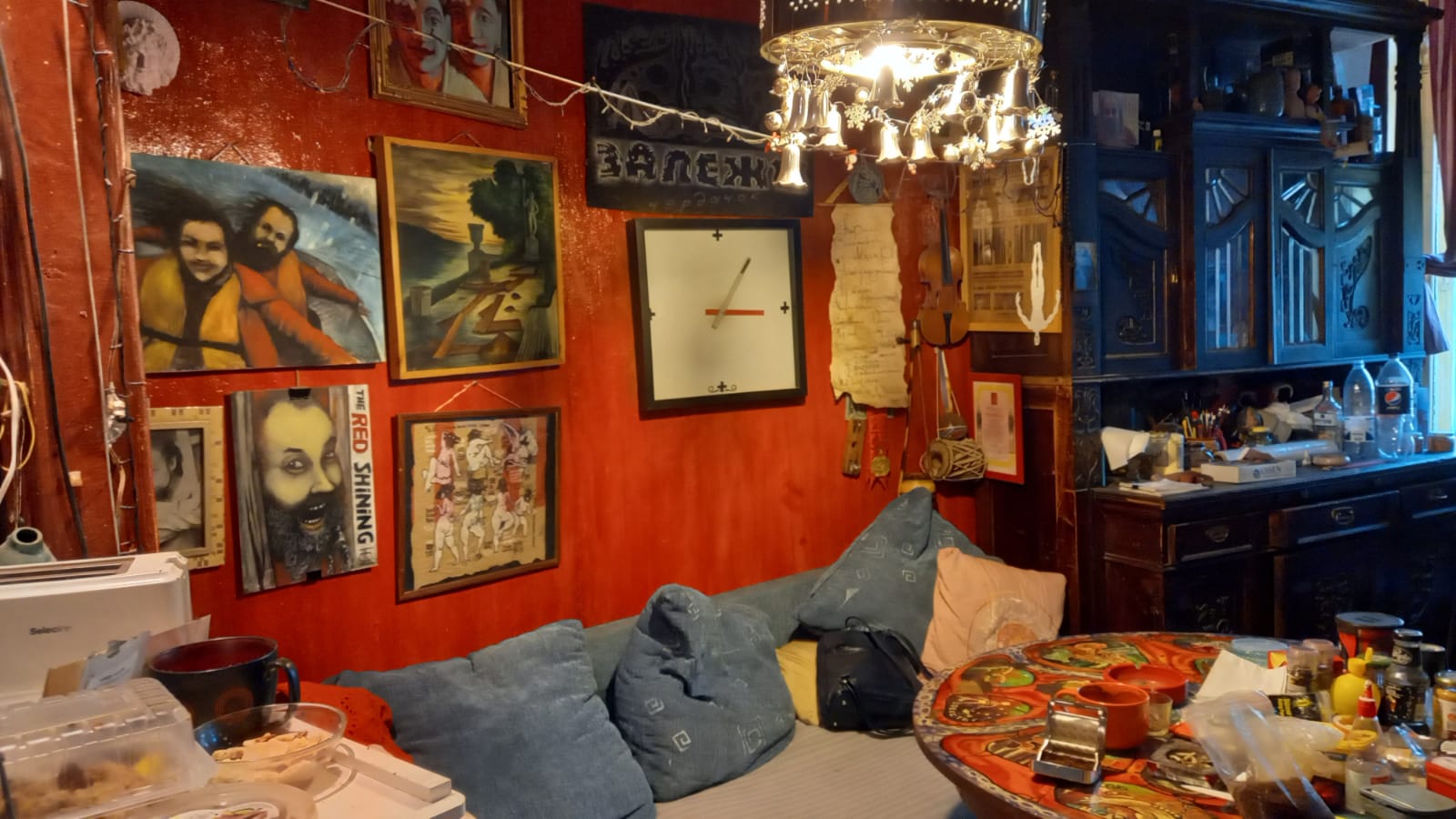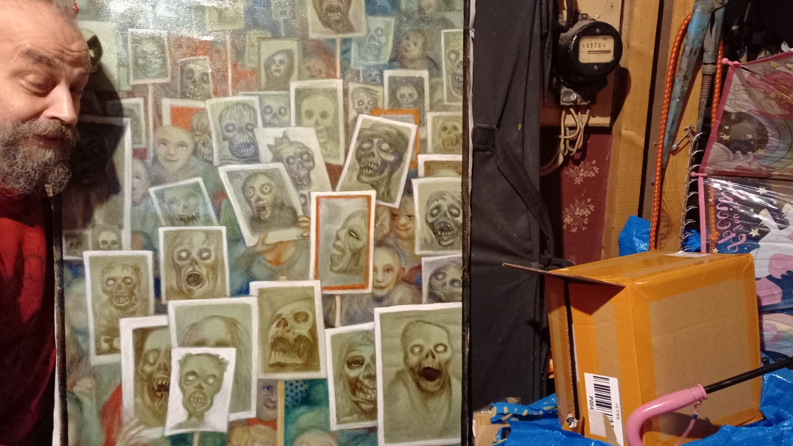 – Мы им рассказали, что тут просто сборище художников, которые хотят, чтобы их картины видели не только они сами, что здесь нет никакой цензуры, что это свободная галерея на базе мастерской. Правил у нас нет, либо придумываем темы, либо приглашаем какого-то художника, близкого по духу. Основное направление – смех и веселье, дуракавалянье и гороховое шутовство. Конечно, есть у нас и сатирические выставки, и сатира у нас не беззубая. На эту ситуацию я смотрю с надеждой на здравый смысл. Пришло распоряжение следователям узнать, действительно ли картина Миллера оскорбляет ветеранов. Следователь пришел и спросил с подковыркой, было ли у нас изображение "Бессмертного полка". Но у нас такого не было, выставка не об этом, на самой картине какие-то плакаты с черепами, какой-то Кащей непонятный, – говорит Копейкин. – Я следователю говорю – посмотрите, где здесь ветераны, их нет, это какой-то зомби-апокалипсис, сейчас это модная тема, везде реклама фильмов, игр про зомби. А у Кирилла вообще был ряд работ, где люди идут со всякими плакатами – то со свиньями, то с квадратами Малевича, теперь вот с черепами. Никаких атрибутов и символов там нет. Я понимаю, что у кого-то есть шаблоны в голове, но на самом деле там ничего такого нет.