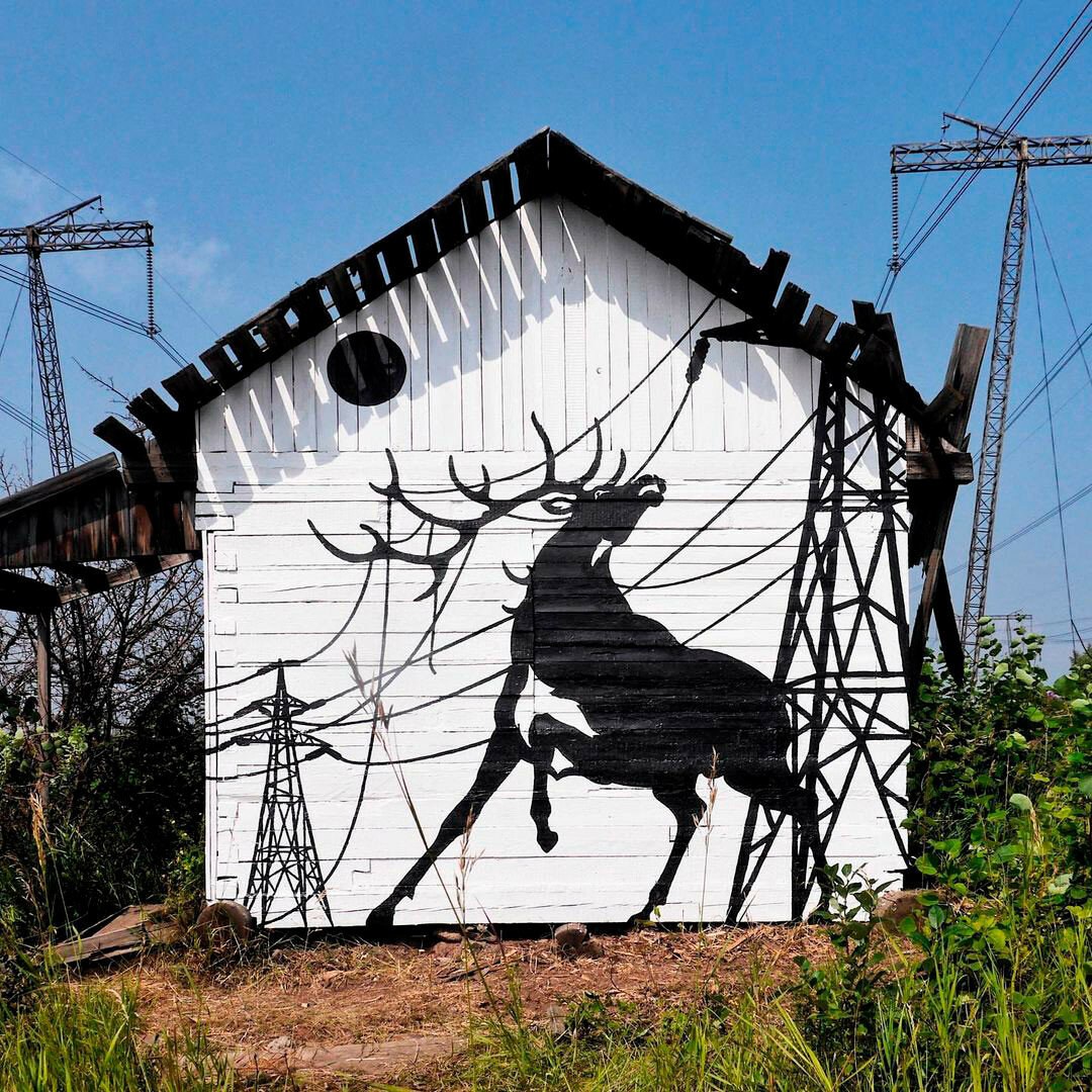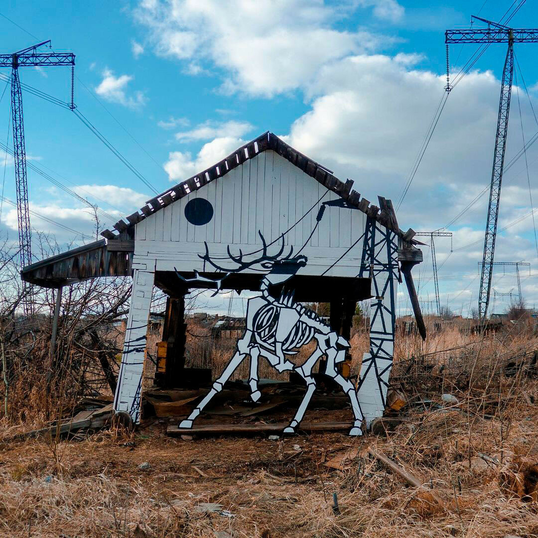 – Брошенная сгнившая дача, на которой я нарисовал "Оленя", работу @zoomstreetart, зиму в Братске не пережила. Дом распилили то ли на дрова, то ли на новую стройку. Увидев остов с остатками головы оленя, я спросил у автора, не против ли он, если я сделаю на месте выпиленного туловища, скелет. И вернул остатку дома остаток "Оленя".