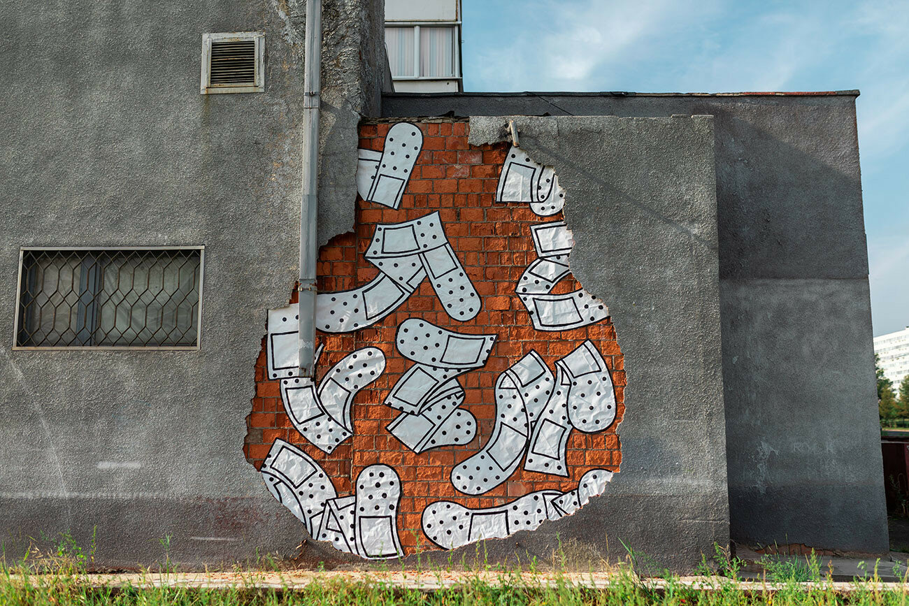 – Видимо. Он, когда мы искали необходимую локацию, очень своеобразно выразился. Может, дело, конечно, в кривом переводе, но Деде написал: "Мне нужно здание, которое нуждается в каком-нибудь исцелении". Я ему стал разные варианты присылать – трещины в асфальте, обшарпанные дома (в Братске с этим нет дефицита). В итоге сошлись на этой стене, он нарисовал эскиз, как должны пластыри располагаться, как должны выглядеть, а я это потом реализовал.