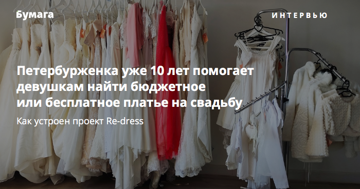 Десять лет назад петербурженка Анна Кочкина не смогла продать свое свадебное платье и задумалась, как использовать его повторно. Так появился проект Re-dress.