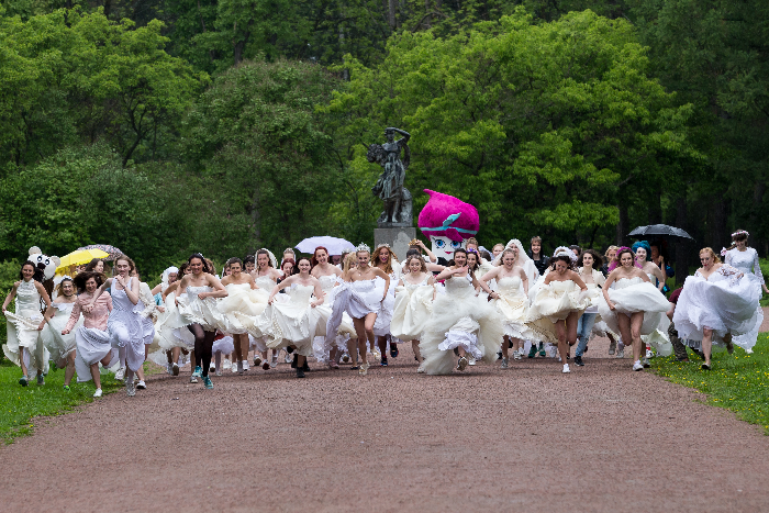 Еще один масштабный проект, с которым мы сотрудничали несколько лет, это благотворительный марафон «Бегущая невеста», направленный на привлечение внимания к ранней диагностике онкологических заболеваний у женщин. Его организует моя подруга Лена Дмитриевская, которая сама пережила рак. Сначала она проводила подобные марафоны в своем родном городе — Иванове, а когда приехала в Петербург, решила провести их тут. Участницы марафонов должны были пробежать стометровку в свадебных платьях, как символе чистоты и красоты. В забеге в том числе участвовали девушки с онкологией в периоде ремиссии.