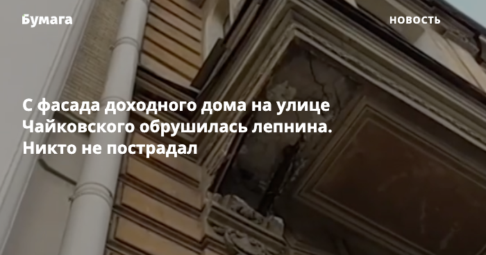 На улице Чайковского, 42 в Центральном районе Петербурга с фасада дома обрушилась часть лепнины, сообщают очевидцы в соцсетях.