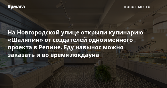 На Новгородской улице, 12 открыли городскую кулинарию «Шаляпин», сообщили «Бумаге» представители проекта. Кулинария находится рядом с одноименным рестораном. Другая кулинария «Шаляпин» работает в Репине.