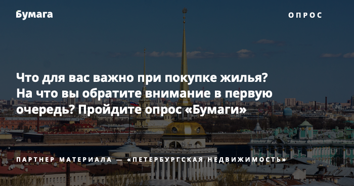 Как вы относитесь к покупке недвижимости и кому готовы доверить проведение сделки: застройщику, агрегатору или конкретному специалисту? Вместе с «Петербургской Недвижимостью» «Бумага» проводит анонимный опрос, чтобы узнать, какие критерии важны для петербуржцев при покупке недвижимости, — он займет всего несколько минут.