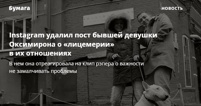Instagram удалил пост бывшей девушки Оксимирона Веры под ником tricksterquest. В публикации она рассказала о «лицемерии и вранье» в отношениях с рэпером в конце 2000-х, тем самым отреагировав на клип «Кто убил Марка?» о том, как важно не замалчивать проблемы.