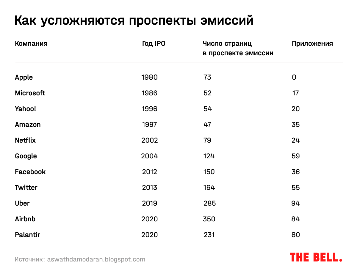 Всю существенную информацию эмитенты перед IPO должны включать в проспект эмиссии. В документе на несколько сотен страниц разобраться не просто. Автор известных учебников по инвестиционному анализу, профессор финансов в Школе бизнеса Стерна при Нью-Йоркском университете Асват Дамодаран отмечает, что в последние десятилетия проспекты IPO и годовые отчеты стали одновременно более громоздкими и менее информативными. Но некоторые выводы сделать можно.