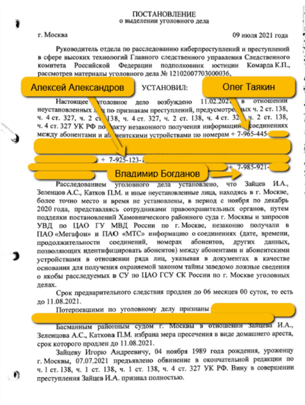 Уголовное дело было выделено в несколько производств, в одном из которых ключевыми фигурантами являются бывший фитнес-тренер из Балашихи Игорь Зайцев, Александр Зеленцов, который познакомился с Зайцевым во время персональных тренировок, и Петр Катков. Зайцев уже дал признательные показания, поэтому в его отношении дело рассматривается в особом порядке. По его словам, летом 2020 года он купил поддельное удостоверение оперуполномоченного МВД, после чего Зеленцов предоставлял ему поддельные решения суда, с которыми Зайцев обращался к операторам мобильной связи и в mail.ru и получал доступ к персональным данным людей, на которых им поступал заказ.