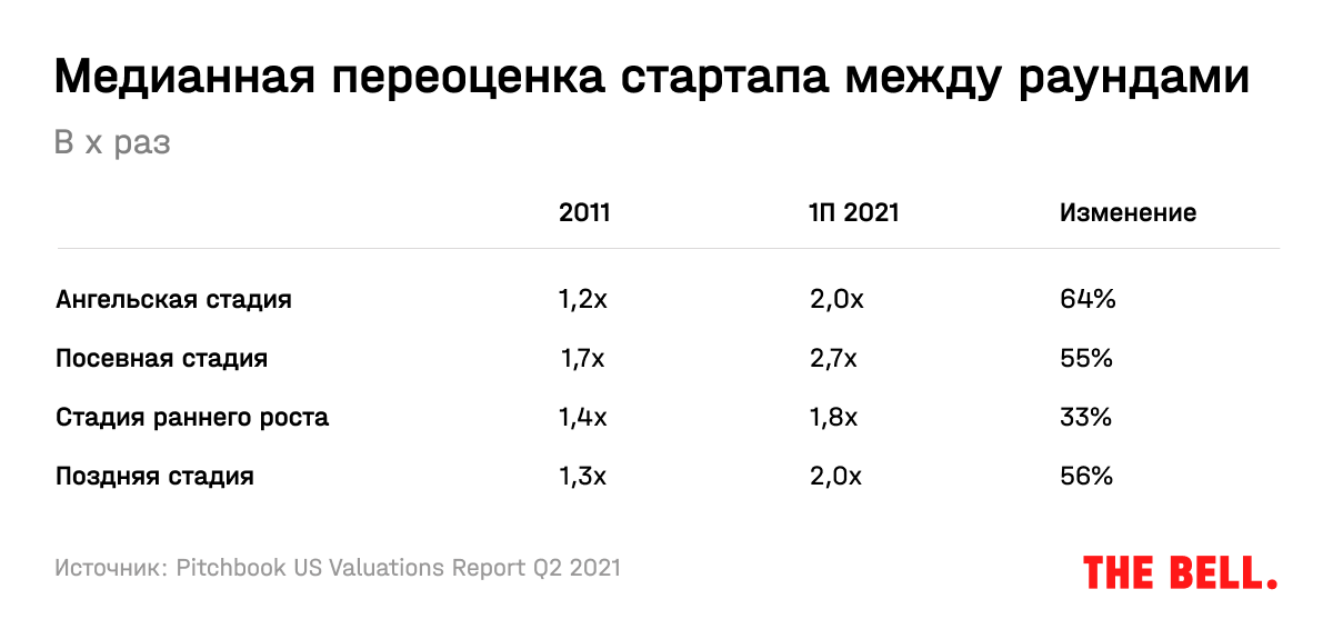 Важный момент для инвесторов в том, что рост оценок мультиплицируемый. В среднем стартап поднимает следующий раунд по оценке в 1,8–2,7 раза больше, чем в предыдущем раунде, тогда как 10 лет назад переоценка между раундами составляла лишь 1,2–1,7 раза. В результате «единорогами» многие стартапы становятся за несколько лет, а не за 7–8 лет, как это было 5 лет назад, и уж тем более не за 10+ лет, как это было 10 и более лет назад.