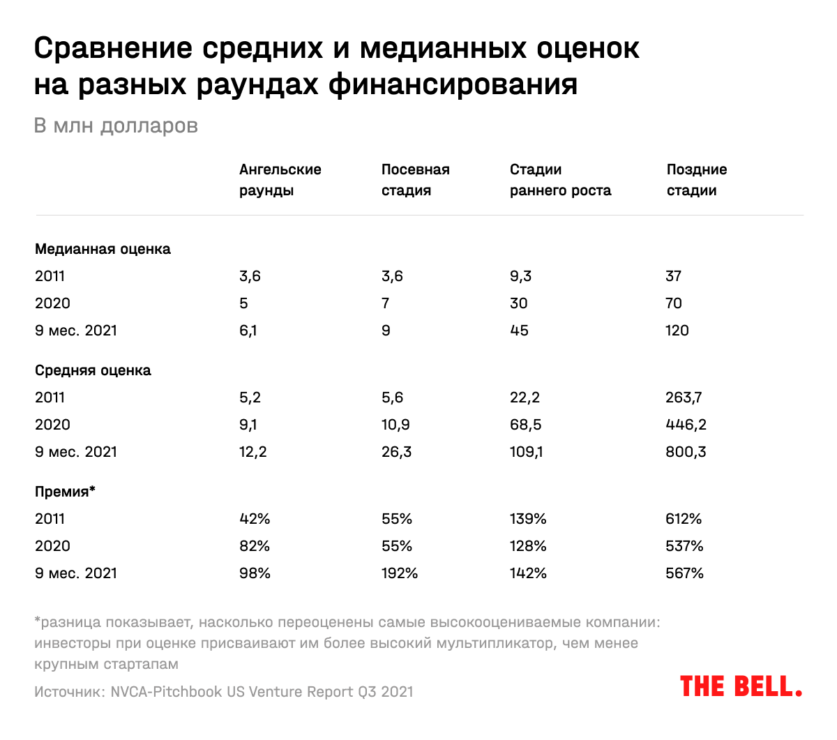 Еще одна характерная черта постпандемийного венчурного рынка — завышенные оценки самых привлекательных для инвесторов компаний. К таким стартапам выстраиваются очереди из желающих вложить средства, и их премия к медианным средним значениям рынка наблюдается уже на ранних стадиях.