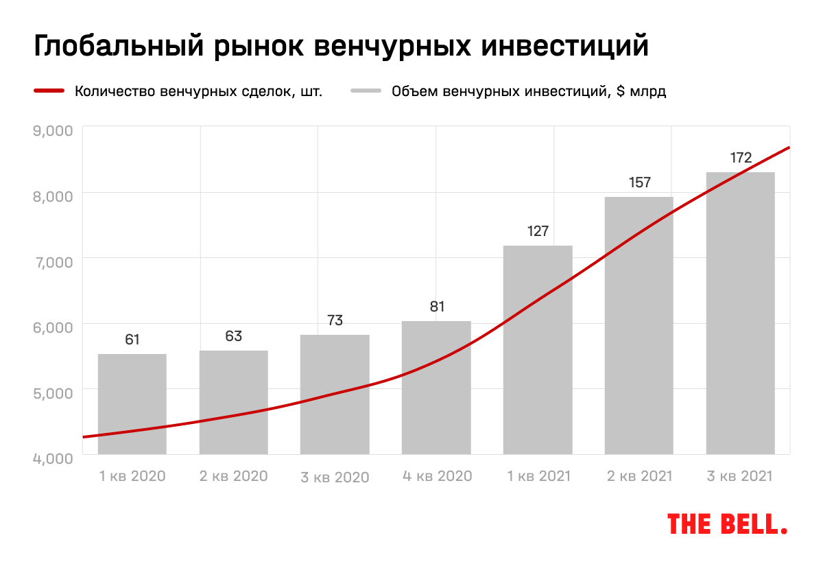 Финансовые рынки в 2020–2021 годах переживают глобальный бум, не исключение и венчурный рынок. За 9 месяцев 2021 года венчурные инвесторы вложили почти $456 млрд в стартапы на разных стадиях более чем в 22,8 тысячи сделок. Согласно подсчетам KPMG, это уже на 64% больше по объему и на 20% больше по количеству сделок, чем за весь 2020-й, а в сравнении с 9 месяцами предыдущего года рост становится стремительным — 131% по объему и 68% по количеству.