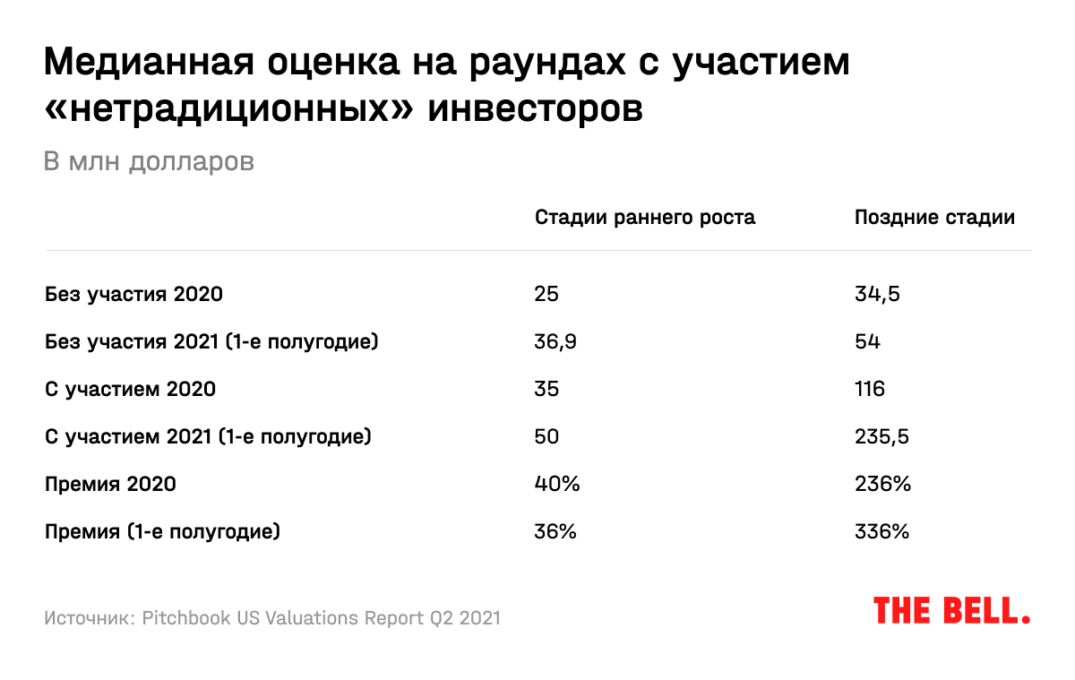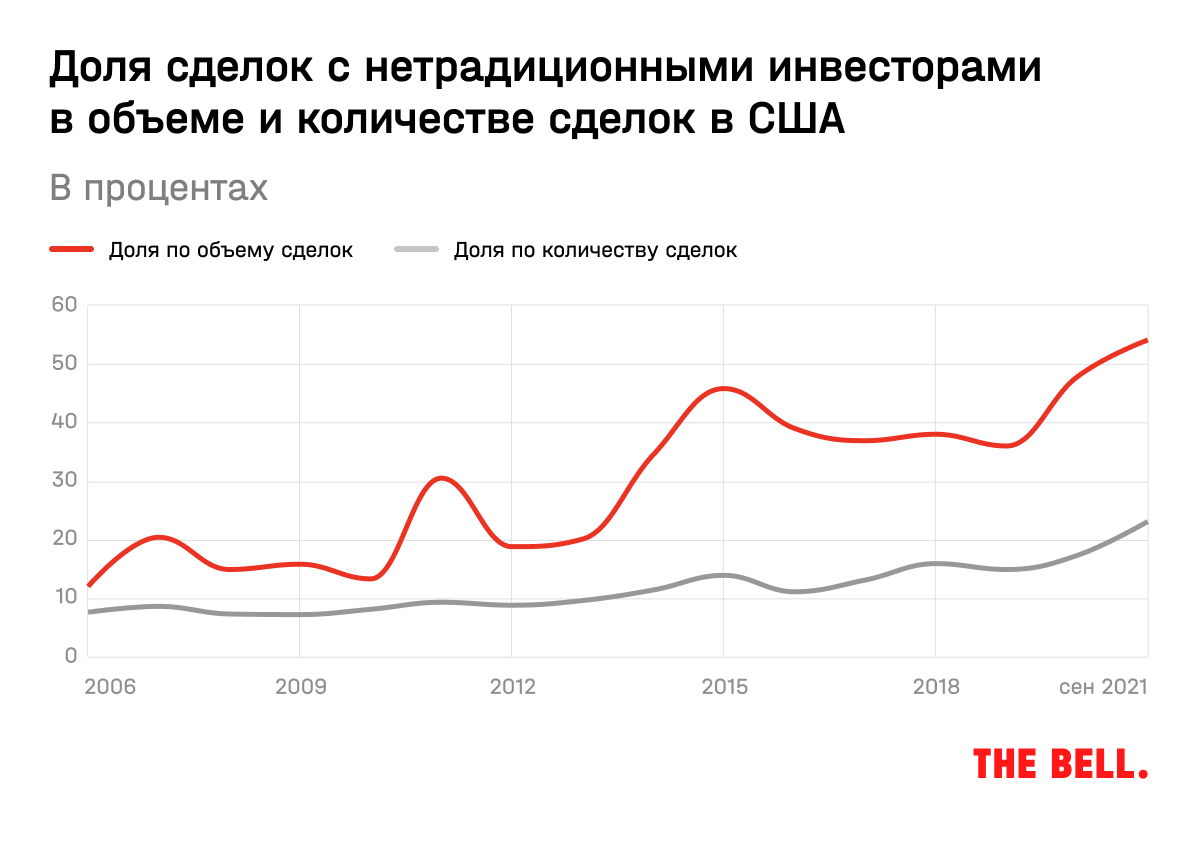В последние годы активную роль на венчурном рынке играют и так называемые «нетрадиционные» инвесторы — хедж-фонды, семейные офисы, корпоративные инвесторы. У них совершенно другая модель принятия решений, другой подход, аппетит к риску. Они — важный фактор разгона всего рынка.