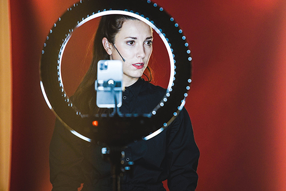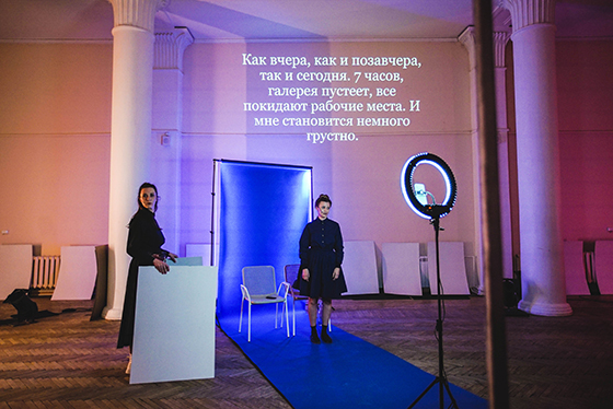 © Anastasia Blur В небольшом, но просторном зале очень высокие потолки. Три колонны. Паркет-елочка. Три девушки — «Алина», «Марина» и «Оля» — по очереди говорят прямо в камеры мобильных телефонов. О картинах. О туфлях. О жаре. О выставке. Об отце. О дыхании. О надписях. Обо всем, что видят, и почти ничего о том, что чувствуют. Загораются и гаснут селфи-лампы. «Алина», «Марина» и «Оля» продолжают фиксировать то, что кажется им реальным. Так же, как это фиксируют камеры их мобильных телефонов.