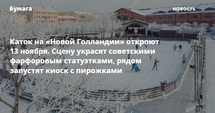 Каток на «Новой Голландии» откроется 13 ноября. Об этом «Бумаге» сообщили в пресс-службе пространства.