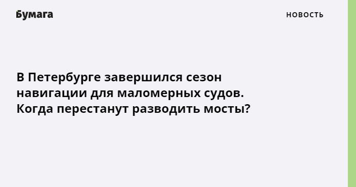 В Петербурге 8 ноября завершен сезон навигации по рекам Петербурга для маломерных судов, пишет «Фонтанка» со ссылкой на комитет по транспорту. «Бумага» узнала у «Мостотреста», когда в Петербурге завершится разводка мостов.
