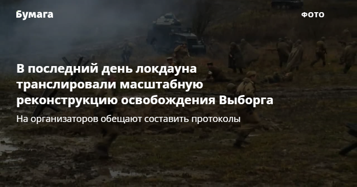 В администрации Выборгского района сказали 47news, что в локдаун запрещены все мероприятия и реконструкцию освобождения Выборга никто не согласовывал. «На этот период не прописано ни десять, ни пятьдесят [участников]. <…> Всё это безумие нереально отследить. <…> Нарушают, конечно. По факту административные протоколы полиция на них составит. Имеет полное право», — пообещал изданию глава администрации Валерий Савинов.