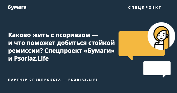 «Бумага» и портал Psoriaz.life публикуют партнерский спецпроект о жизни людей с псориазом — хроническим неинфекционным воспалительным заболеванием с преимущественным поражением кожи: об их борьбе с болезнью, принятии своего тела и ощущении свободы во время ремиссии.