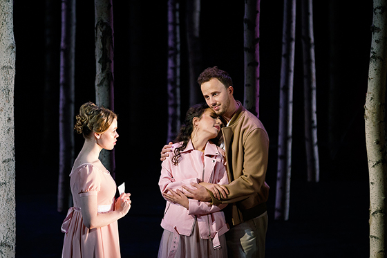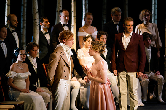 © Ольга Керелюк / «Урал Опера Балет» Максим Шлыков — Онегин Евгений и Таня станут современной влюбленной парой. Евгений Львович и Татьяна Дмитриевна, прозябавшие на задворках сюжета, исчезнут. Ленский накроет мертвого Владимира своим пальто и выйдет из игры. За ним последуют и три Ольги, а Онегин и Татьяна бесповоротно провалятся в XIX век, в романтическую костюмную драму — и в прочную иллюзию театрального нарратива. Евгений окажется секундантом Онегина, юным месье Гильо, но отстранение младших от сюжета оперы Чайковского, медленное таяние их линий будет продолжаться. В сцене бала Евгений и Татьяна станут наблюдателями, музейными фланерами, снимающими сцену-инсталляцию, яму-инсталляцию, зал-инсталляцию на телефон, а в последней картине — с трудом различимыми фигурами в глубине сцены. После последнего аккорда оркестра они выйдут на авансцену, чтобы едва кивнуть публике, а потом продолжат партию в бадминтон, начатую Евгением Львовичем и Татьяной Дмитриевной еще до того, как открылись двери зрительного зала.