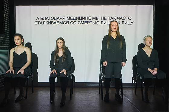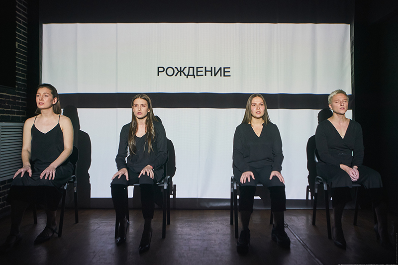 © Предоставлено пресс-службой фестиваля «Хаос» Сцена из спектакля «Место» Вторая часть «Коромыслей», только что номинированная на «Золотую маску — 2022» в категории «Эксперимент», — изысканное концептуальное действо на тему смерти и возможности пережить уход близкого полноценно. То есть так, как не позволяет современная культура: выпевая погребальный фольклор, актрисы перформанса пребывают в качестве исполнительниц, чью патетику и чисто физическую мощь присутствия снижают или комментируют бегущие по экрану титры, но еще — в качестве персон, не прячущихся за актерской оснащенностью. В титрах — сомнения и вопросы, тревожащие создательниц «[сырой земли]» и конкретно — Полину Кардымон, которая простым и красивым жестом открывает заново значение песен и ритуалов, но также и признается себе и нам в незнании, непонимании и равнодушии. Обе работы, «Место» и «[сыра земля]», ценны, конечно же, тем, что родились не в Москве, а в столице Сибири. Но еще больше — откровенностью и спокойной честностью по отношению к себе.