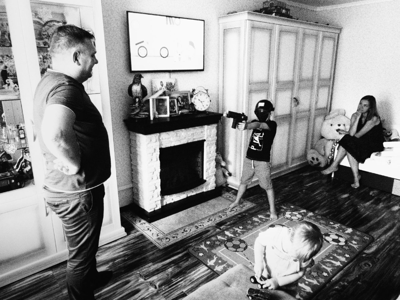 Худяков тормозит возле небольшого кирпичного дома в частном секторе — снаружи забор из камня, внутри — ковры, брошенные прямо на бетон. Семья Худякова — родители, двое детей от первого брака, двое от второго и беременная жена Ольга. Мне говорят, что в доме можно не разуваться, и настойчиво угощают чаем, кофе и пиццей.
