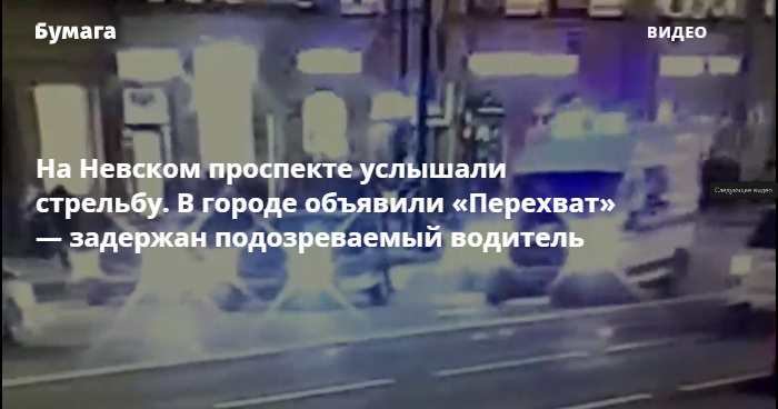 Вечером 9 ноября на Невском проспекте услышали выстрелы из автомобиля «ВАЗ». Из-за этого в городе объявили план «Перехват», задержан подозреваемый, сообщили «Бумаге» в пресс-службе ГУ МВД по Петербургу и Ленобласти.