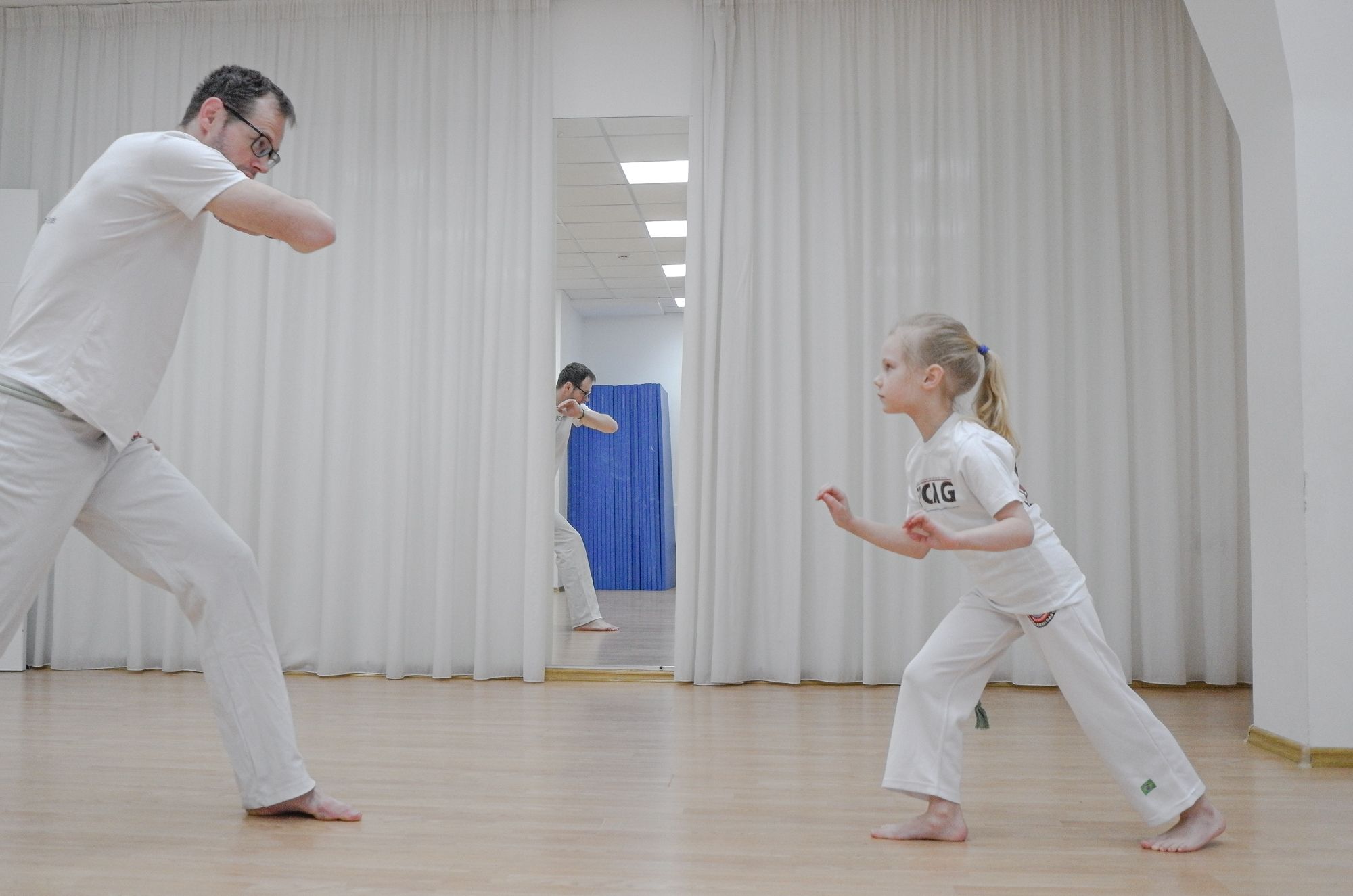 Капоэйра — универсальное бразильское боевое искусство, в котором присутствуют музыка, танец, песни и акробатика. Развивает уверенность в себе, музыкальные и физические способности, ребенок учится самозащите, не используя при этом агрессию