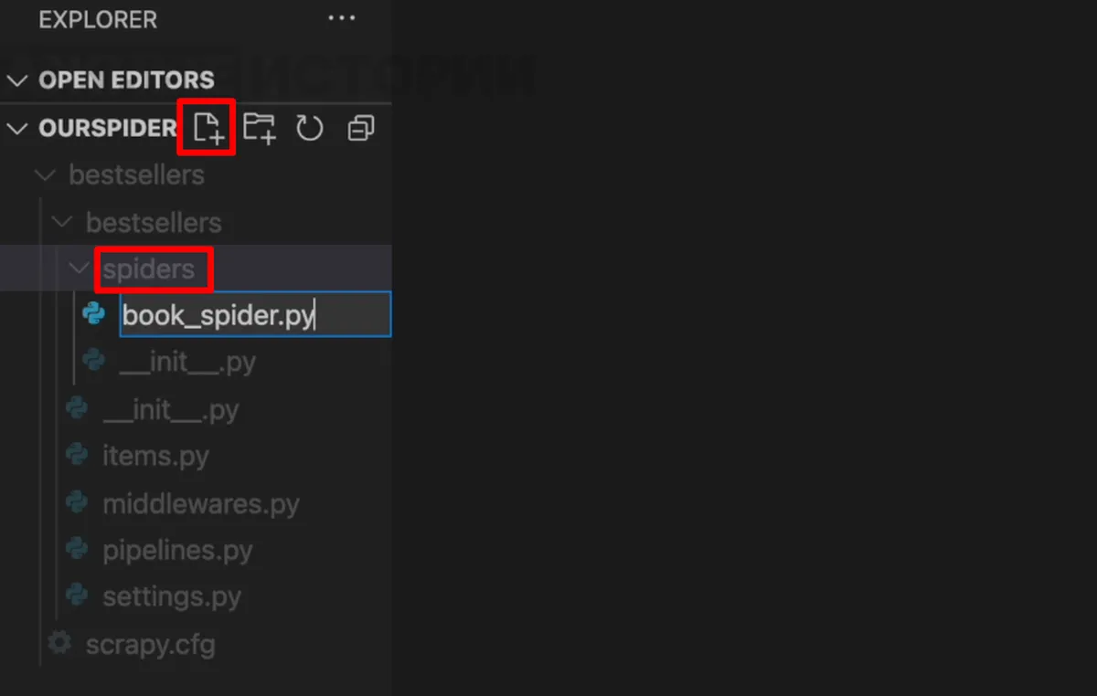 Мы видим, что в папке с проектом появилось несколько папок и файлов. Это файлы конфигурации, настройки нашего скрейпера. Подробнее о том, что содержится в каждом файле, написано в официальной документации Scrapy. Но сейчас нас эти файлы не интересуют. Мы заходим в папку spiders. В ней будут лежать пауки — это файлы, в которых мы прописываем, что именно нужно собирать на сайте. Создадим первого паука. Для этого нужно нажать на значок папки рядом с названием основной папки — bestsellers. Назовем нашего паука book_spider.py. Не забываем указывать расширение .py для питона.